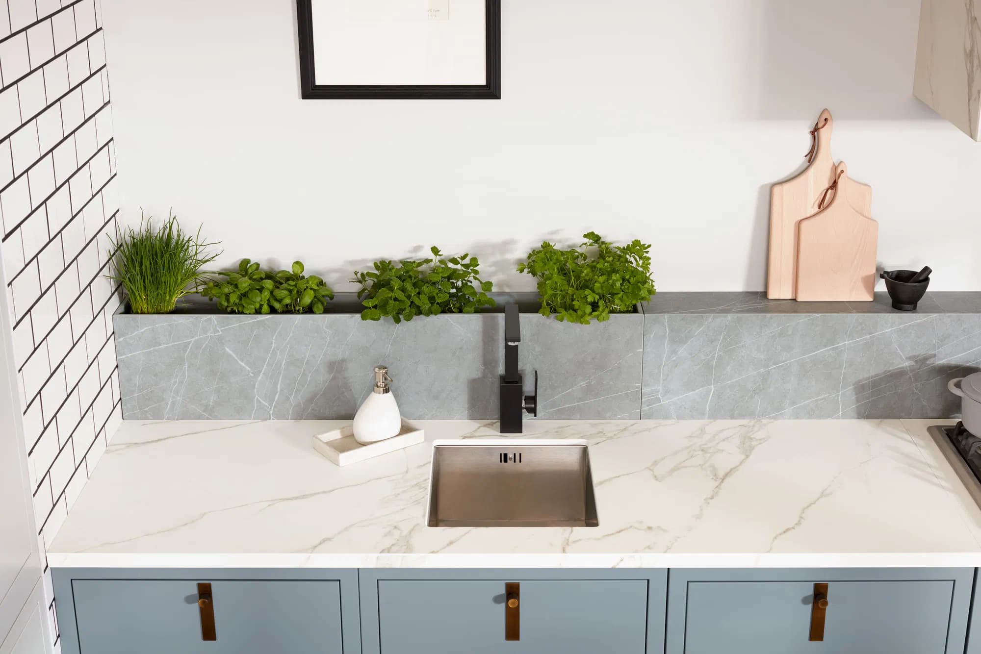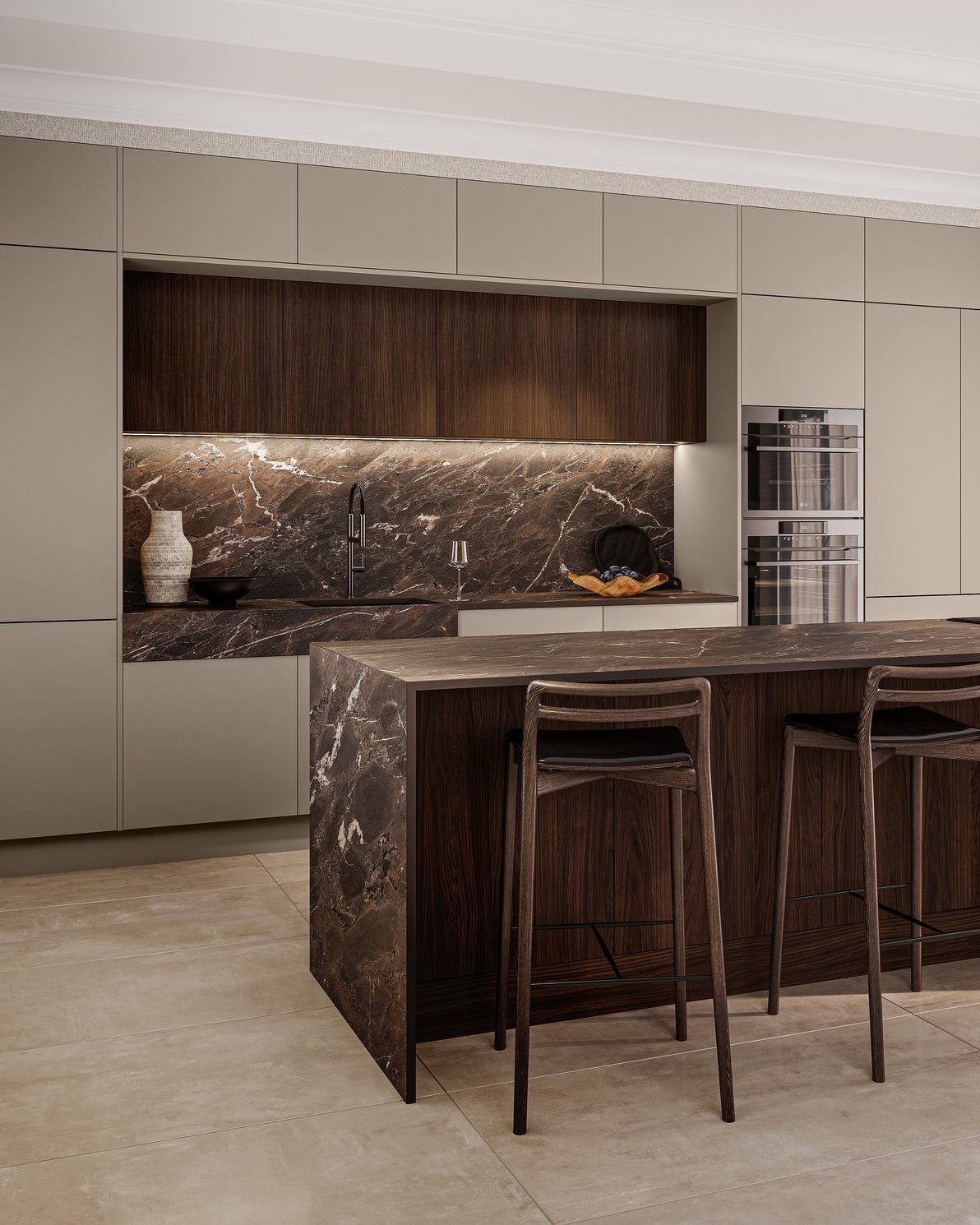 This thoughtfully designed kitchen showcases a sophisticated two-tone palette, combining Spitfire and Light Grey cabinetry with premium quartz surfaces and integrated Neff appliances. Elegant, functional, and timeless in its appeal.