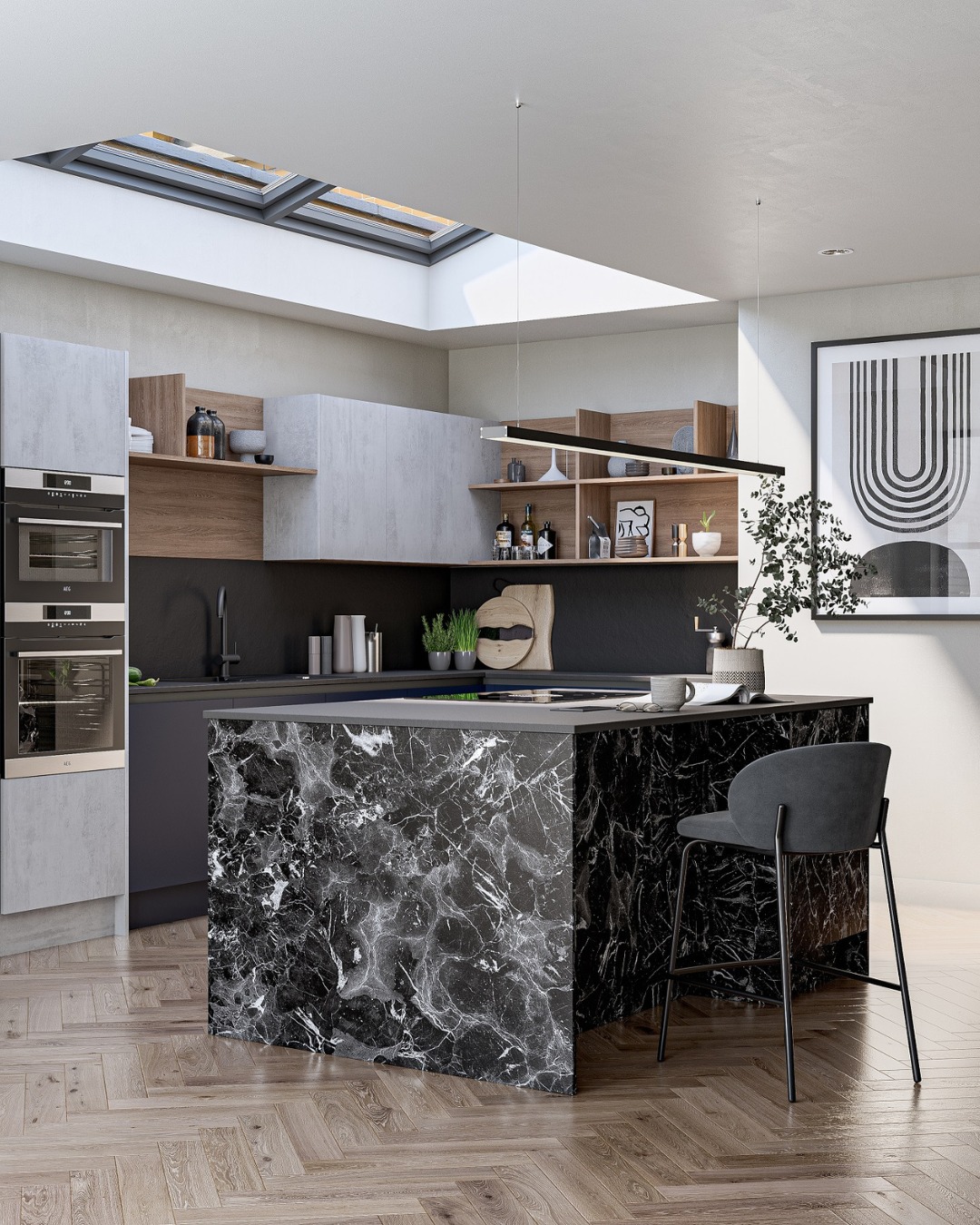 This modern kitchen seamlessly blends functionality with contemporary aesthetics, featuring a striking two-tone colour scheme. The soft grey base units contrast beautifully with the deep black cabinetry, creating a stylish and sophisticated look.