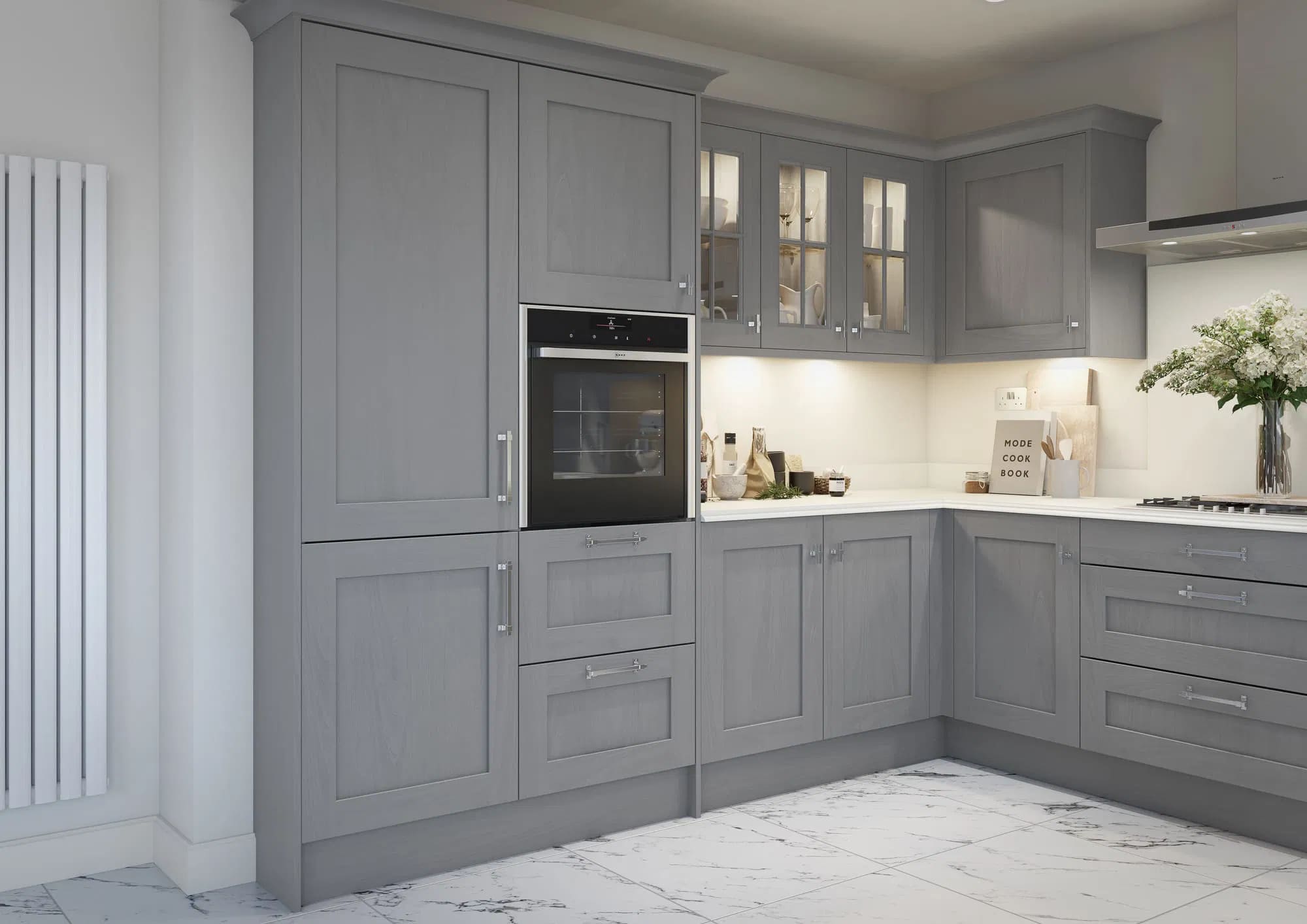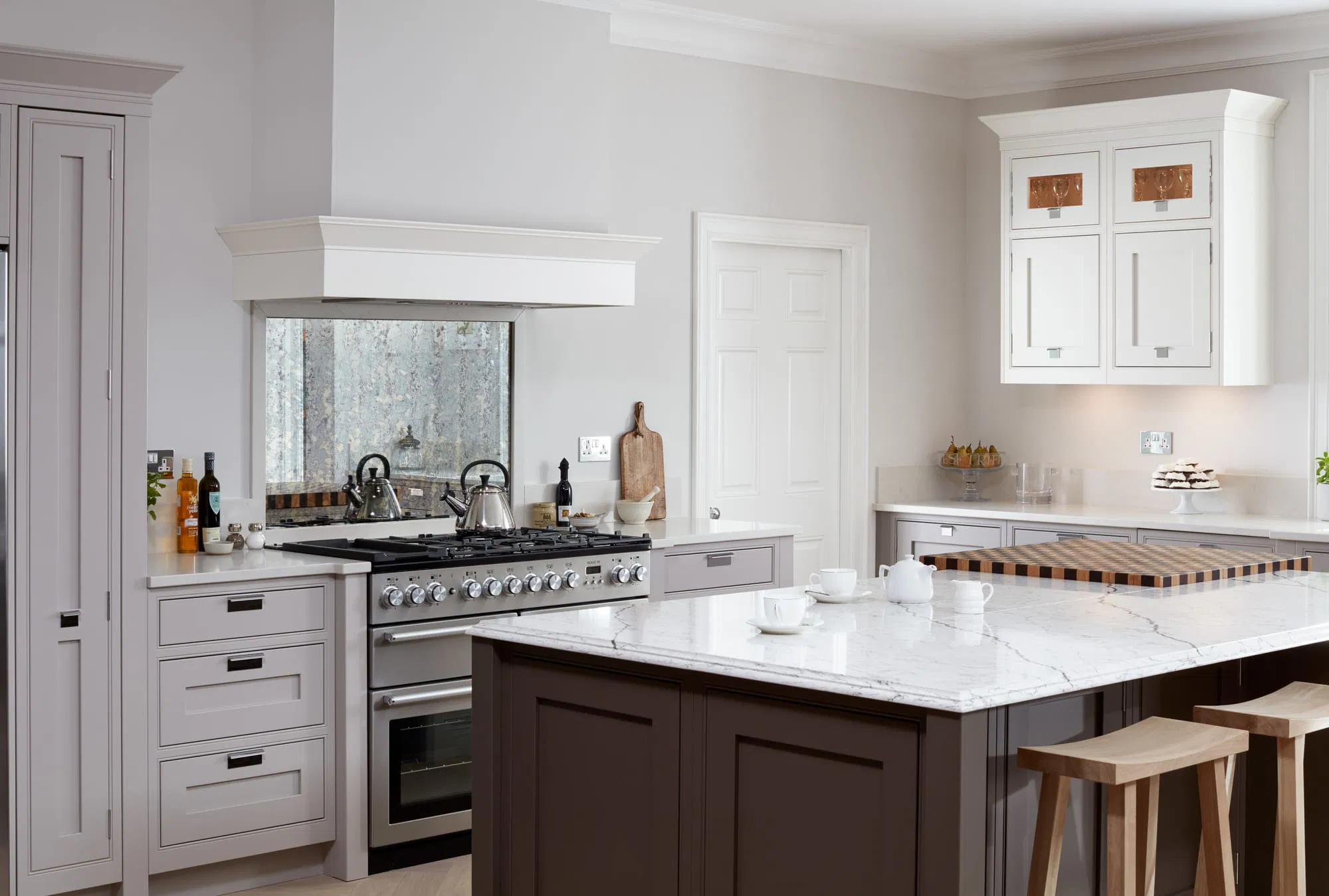 This timeless Shaker-style kitchen blends classic design with contemporary elements, creating a space that is both functional and inviting. Featuring soft grey cabinetry, luxurious quartz worktops, and modern appliances, this kitchen is designed for both cooking and socialising.
