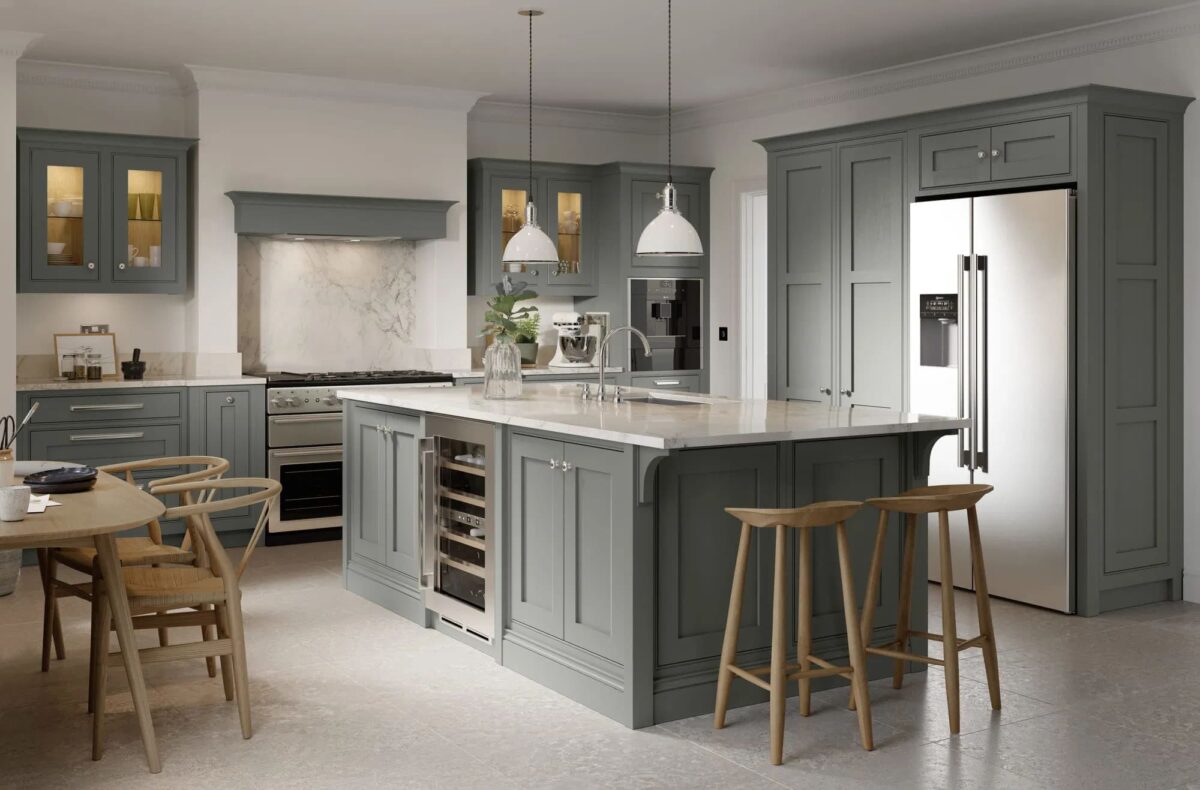 This timeless Shaker-style kitchen blends classic design with contemporary elements, creating a space that is both functional and inviting. Featuring soft grey cabinetry, luxurious quartz worktops, and modern appliances, this kitchen is designed for both cooking and socialising.