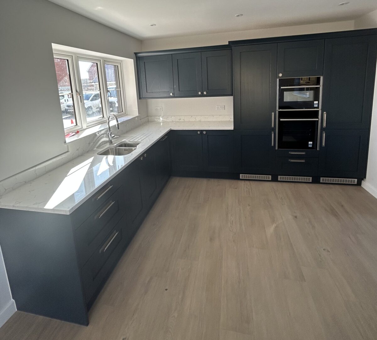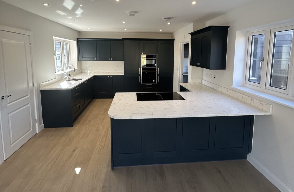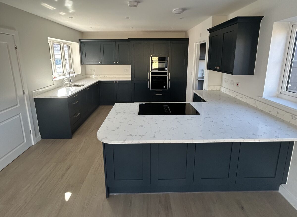 This kitchen strikes just the right balance between traditional charm and modern convenience, perfectly suited to busy family life. The Mornington Shaker cabinets in Hartforth Blue add a real sense of depth and personality, while the Strata Quartz White Venato worktops keep things fresh and refined with their clean, elegant look. The mix of classic craftsmanship and bold colour gives the space a style that feels both timeless and up to date.
