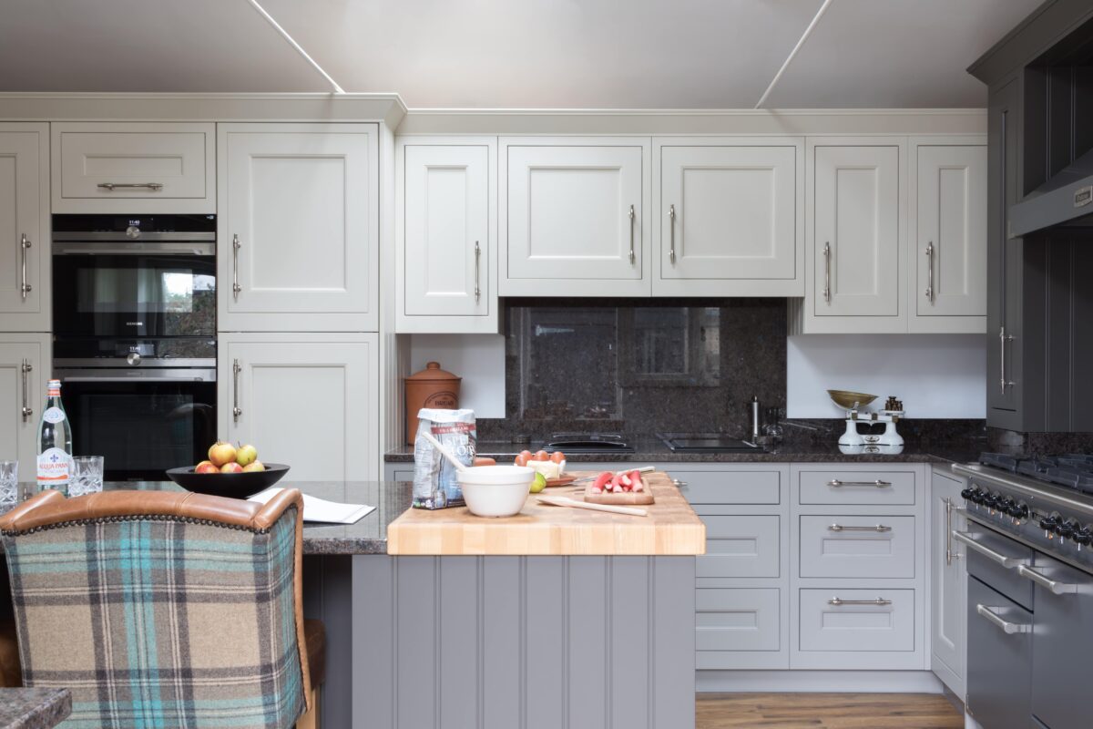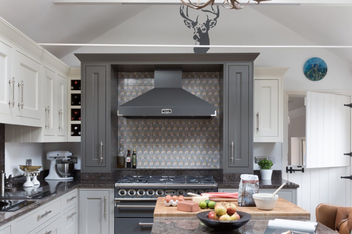 Located in Alconbury, Cambridgeshire, this project's core design brief was to transform a vaulted, open-plan space into a cohesive, highly functional social hub. The sophisticated solution hinged on 1909 In-Frame cabinetry with Quarter Round Beading. The color palette defined the functional zones: perimeter units in Porcelain and Stone maximized light and space, reflecting the natural light from the skylights. This bright backdrop contrasts sharply with the central island and feature range enclosure, both finished in bold Graphite. This dark centerpiece houses the professional-grade Falcon Range and Extractor alongside specialized cooking surfaces like the AEG Tepan Yaki & Induction domino wok. Further modern utility is provided by integrated Siemens built-in ovens and a Neff XL Fridge & Freezer, all set beneath durable Lundhs Antique Granite worktops, creating a perfect blend of high-end specification and traditional charm.