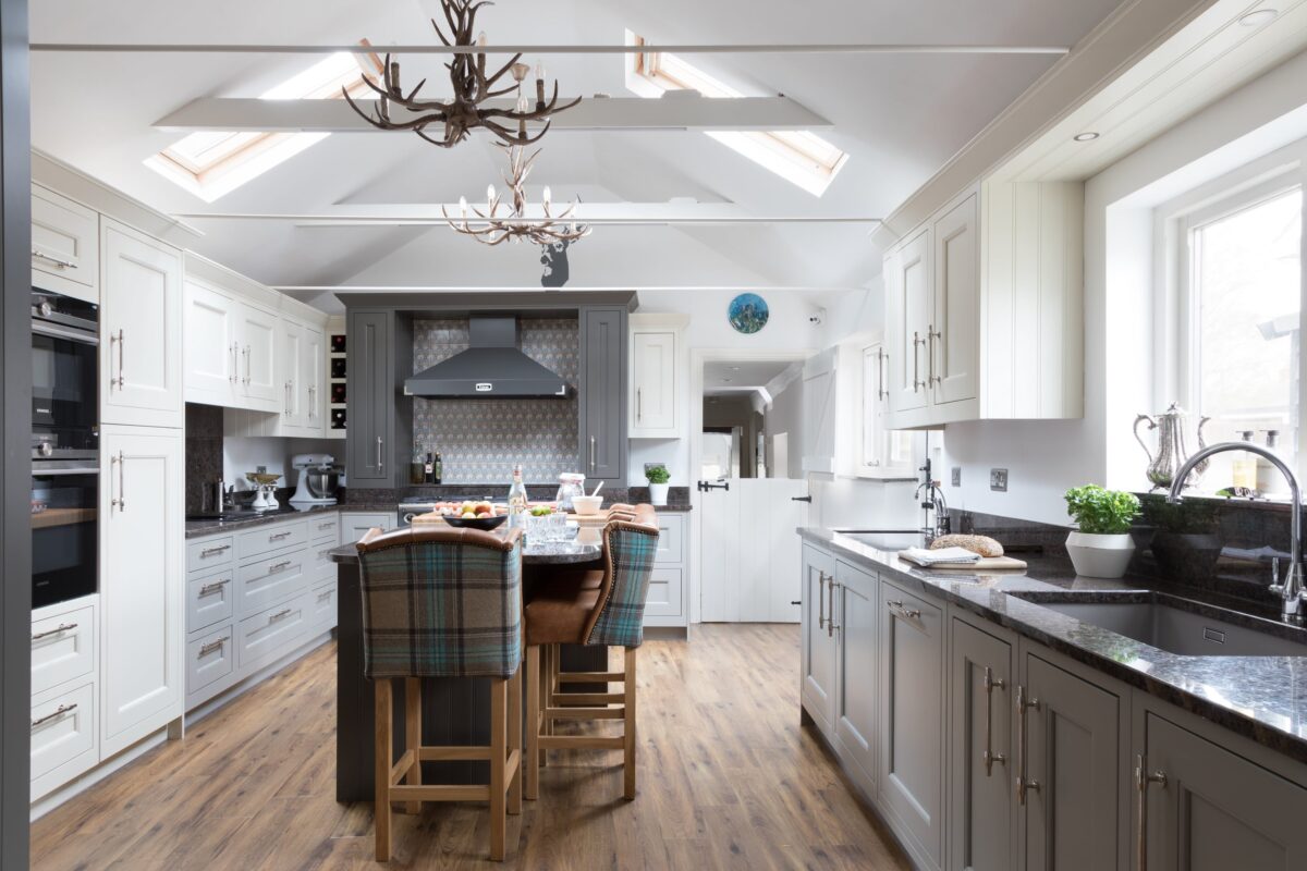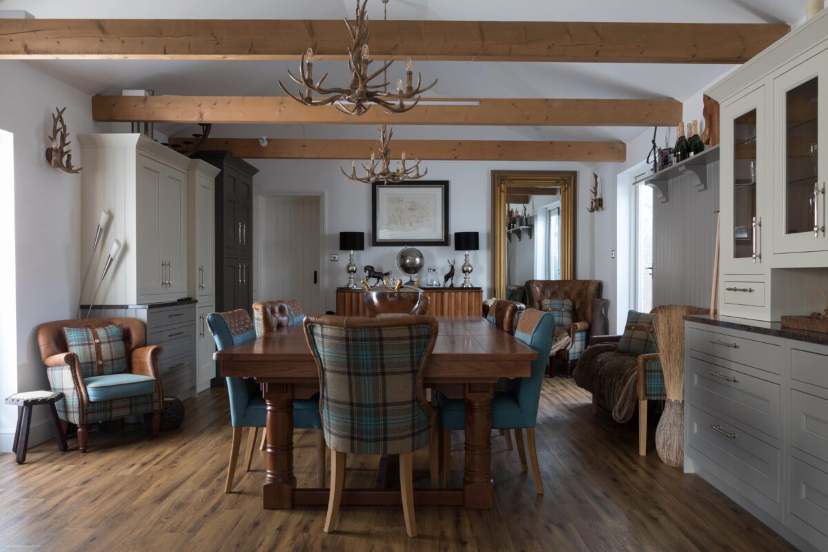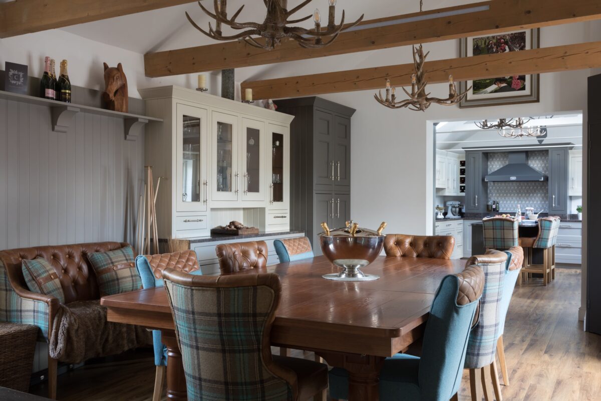 The luxurious yet authentic feel of the space is cemented by the meticulous selection of finishes. The warm, inviting tone is immediately established by the Karndean Art Select Summer Oak LVT flooring and the rustic aesthetic of the exposed wooden beams and striking antler chandeliers. This detail-oriented approach ensures seamless flow between the cooking and dining areas. The two-tone Porcelain and Graphite color scheme continues, providing a consistent backdrop to the bespoke seating arrangements, which feature rich leather and traditional tartan fabrics. By balancing the classic, high-quality 1909 In-Frame millwork with contemporary appliance performance and the hard-wearing functionality of the Lundhs Antique Granite and Karndean LVT, the final environment achieves a uniquely tailored ambiance - a durable, expansive, and deeply personalized country home designed for both daily comfort and impressive entertaining.