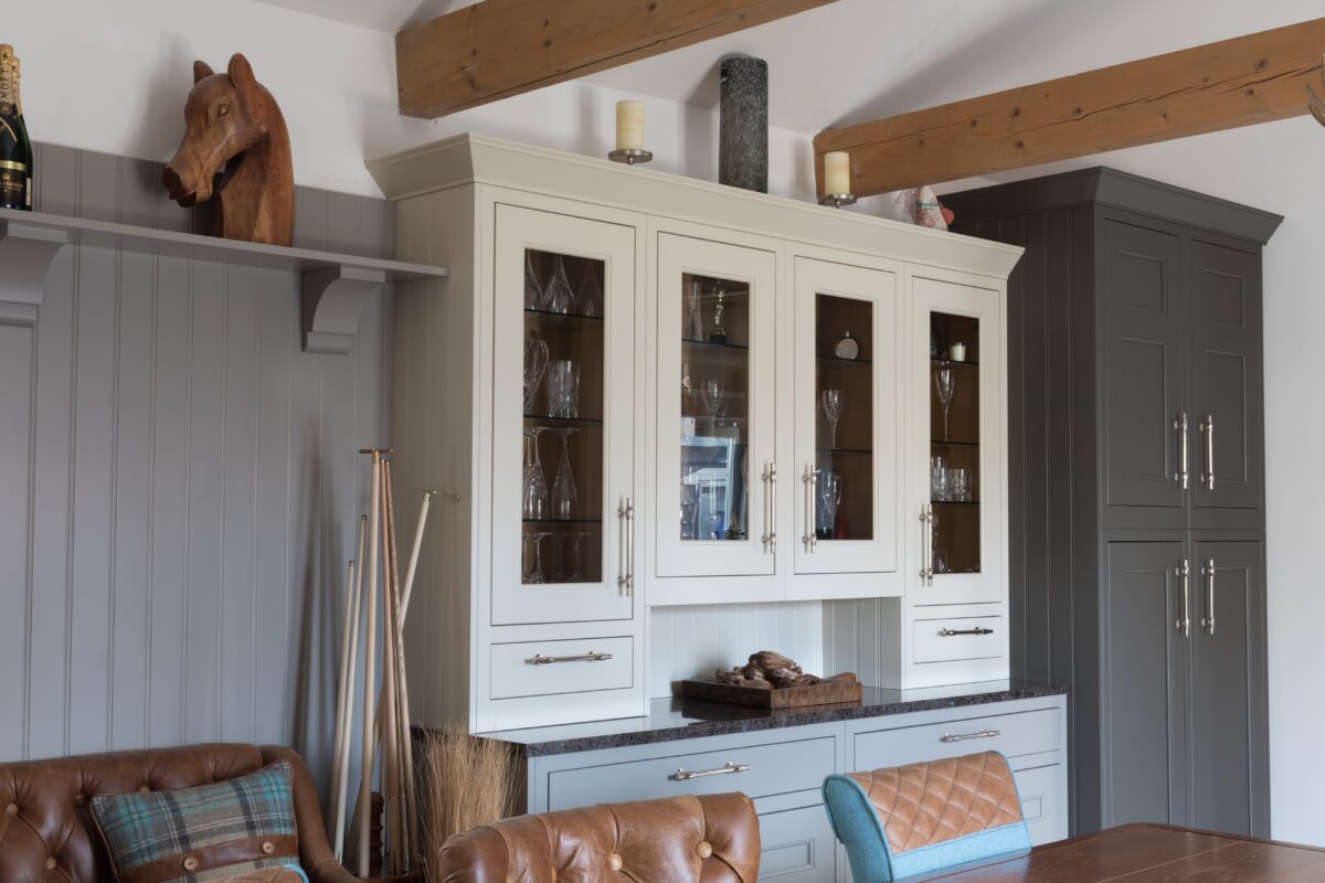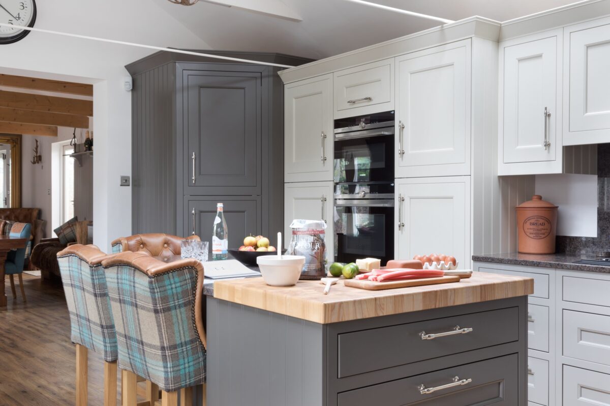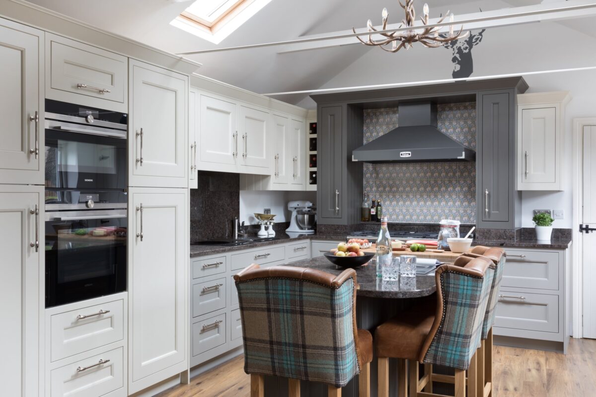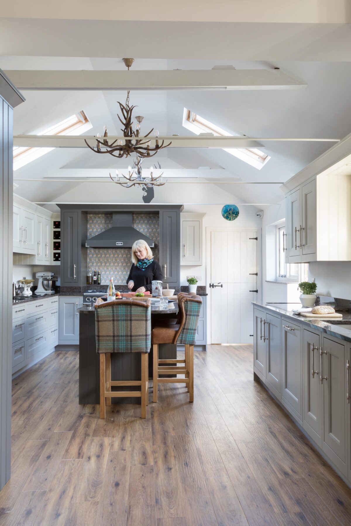 The luxurious yet authentic feel of the space is cemented by the meticulous selection of finishes. The warm, inviting tone is immediately established by the Karndean Art Select Summer Oak LVT flooring and the rustic aesthetic of the exposed wooden beams and striking antler chandeliers. This detail-oriented approach ensures seamless flow between the cooking and dining areas. The two-tone Porcelain and Graphite color scheme continues, providing a consistent backdrop to the bespoke seating arrangements, which feature rich leather and traditional tartan fabrics. By balancing the classic, high-quality 1909 In-Frame millwork with contemporary appliance performance and the hard-wearing functionality of the Lundhs Antique Granite and Karndean LVT, the final environment achieves a uniquely tailored ambiance - a durable, expansive, and deeply personalized country home designed for both daily comfort and impressive entertaining.